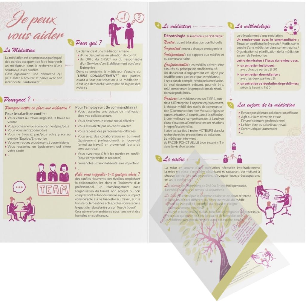 Médiatrice en Entreprise qui souhaitait présenter son activité à travers un ton léger, dynamique et professionnel. Illustration pour la couverture s’inspirant d’un arbre de vie