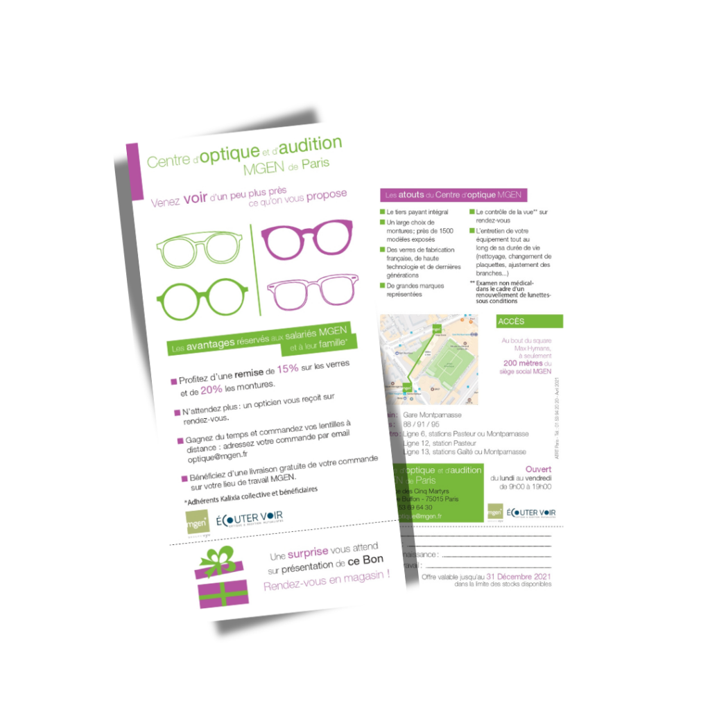 Centre Optique MGEN, du 12ème arrondissement à Paris, flyer promotionnel en partenariat avec ECOUTER VOIR