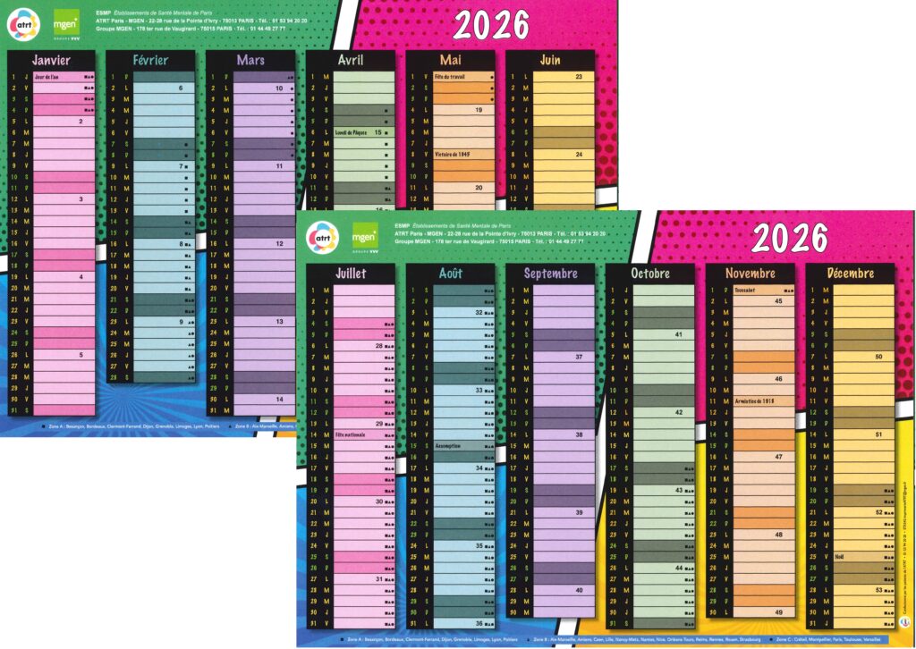 Calendriers muraux, avec perforation au centre afin de pouvoir être suspendu